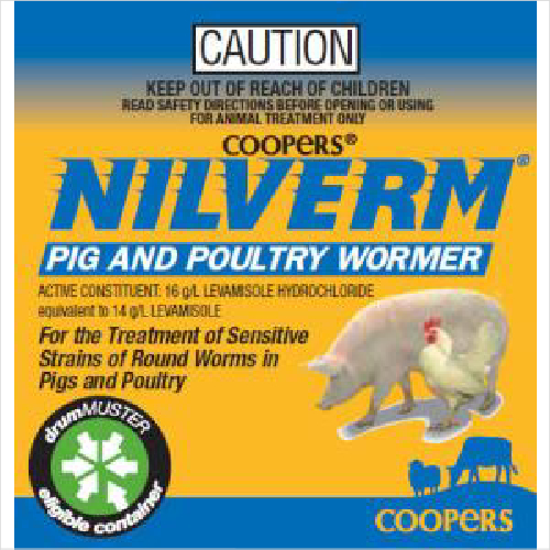 Coopers Nilverm Pig and Poultry Wormer is effective against mature and immature large roundworm (Ascaris suum), stomach worm (Hyostrongylus rubidus), nodule worm (Oesophagostomum dentatum), lungworm (Metastrongylus sp.) and mature kidney worm (Stephanurus dentatus) (NSW and Qld only) in pigs; large roundworm (Ascaridia galli), caecal worm (Heterakis gallinae) and hair worm (Capillaria sp.) in poultry.